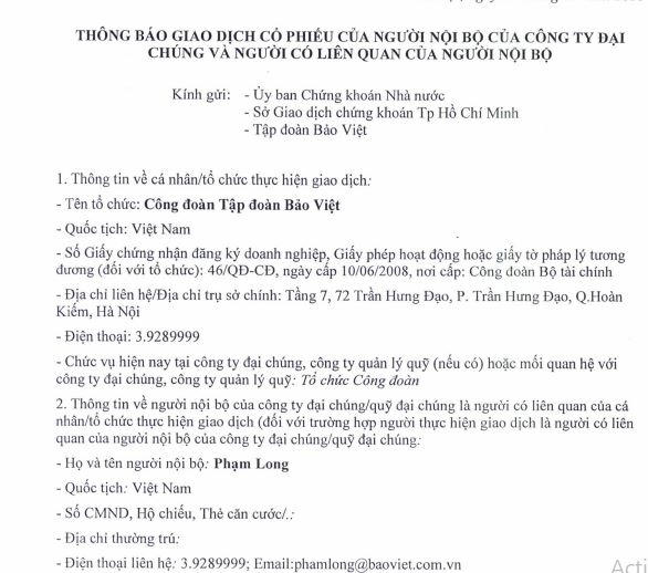 Mới đây, Công đoàn Tập đoàn Bảo Việt (Mã: BVH) đã đăng ký bán ra 127.000 cổ phiếu đang sở hữu.