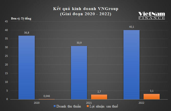 Về kết quả kinh doanh, giai đoạn 2020-2022 chứng kiến sự thăng giáng về doanh thu của VNGroup. Cụ thể, năm 2020, doanh thu thuần của doanh nghiệp này đạt mức 36 tỷ đồng, rồi giảm xuống còn 30,9 tỷ đồng vào năm 2021. Đến năm 2022, doanh thu thuần của VNGroup lại tăng vọt lên 40,1 tỷ đồng, với mức tăng đạt 30%.