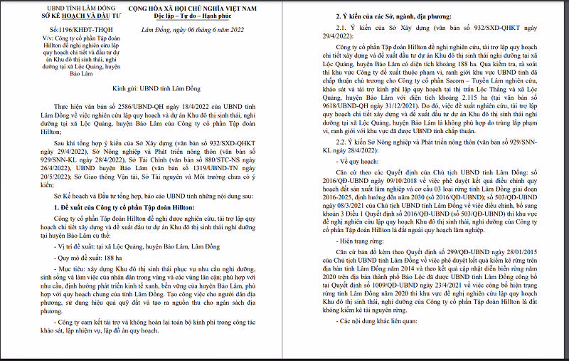 Đối với Sở Kế hoạch và Đầu tư, Sở cho biết đề xuất của Tập đoàn Hillton là phù hợp với chủ trương phát triển của tỉnh. Tuy nhiên, khu vực Hillton đề xuất nghiên cứu thuộc phạm vi, ranh giới khu vực UBND tỉnh đã chấp thuận chủ trương cho Sacom – Tuyền Lâm. Hiện nay Quy hoạch vùng huyện Bảo Lâm đến năm 2035, tầm nhìn đến 2050 chưa được cấp có thẩm quyền phê duyệt, do đó chưa có cơ sở để xem xét đề xuất của Hillton.
