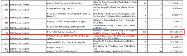 Đáng chú ý, một công ty kiểm toán đình đám là Công ty TNHHDeloitte Consulting Việt Nam cũng bị “nhắc tên” do chậm đóng 3 tháng bảo hiểm của108 lao động với số tiền chậm đóng hơn 4,5 tỷ đồng.