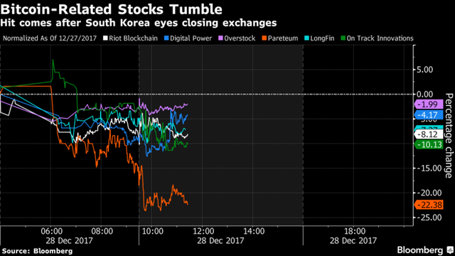 Trên TTCK Mỹ, cổ phiếu Pareteum giảm 26%, trong khi Digital Power và LongFin đều giảm hơn 6% sau khi Chính phủ Hàn Quốc thông báo sắp tới có thể sẽ đóng cửa một số sàn giao dịch tiền số để hạ nhiệt cơn sốt đầu cơ. Lời cảnh báo này ngay lập tức đẩy giá bitcoin có lúc xuống dưới 14.000 USD, giảm 29% so với mức đỉnh được lập giữa tháng 12.