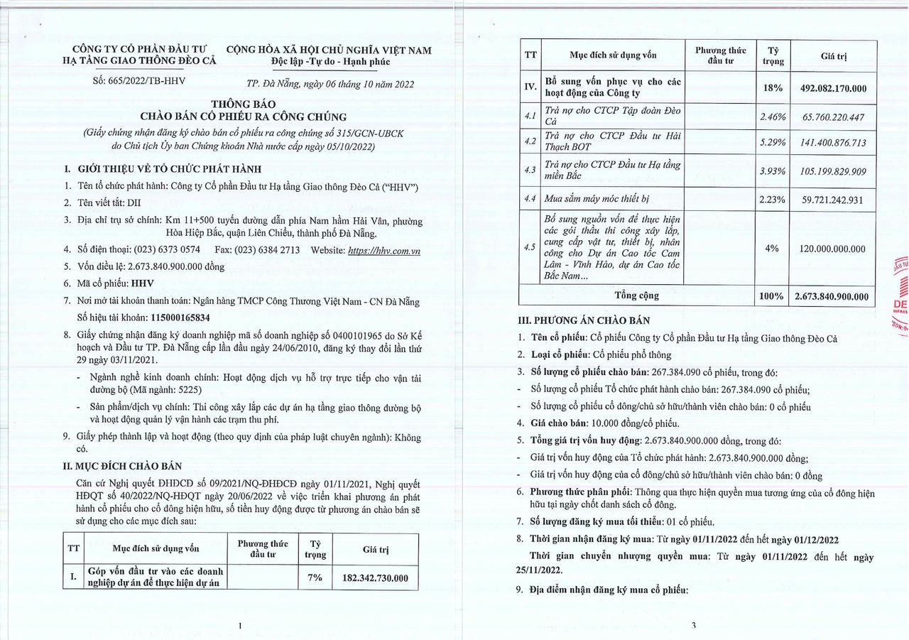 CTCP Đầu tư Hạ tầng Giao thông Đèo Cả (mã CK: HHV) vừa công bố phương án phát hành 267,3 triệu cổ phiếu với giá 10.000 đồng/cổ phiếu. Dự kiến thu về 2.673,8 tỷ đồng.