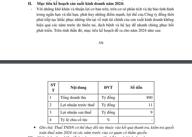 Doanh nghiệp này đã đạt mục tiêu cho kế hoạch sản xuất kinh doanh năm 2024 với doanh thu 890 tỷ đồng và lợi nhuận sau thuế là 9 tỷ đồng. Với kết quả trên, doanh nghiệp này cơ bản gần như đạt được kế hoạch sản xuất kinh doanh năm 2024.