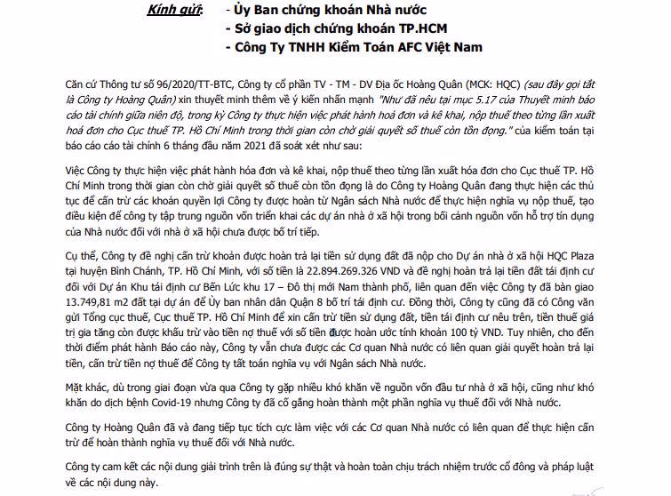 Giải trình về vấn đề này, HQC cho biết tại thời điểm 6 tháng đầu năm 2021, Công ty còn nợ số tiền thuế phải nộp Nhà nước gần 191 tỷ đồng. Tuy nhiên, Công ty đã có những văn bản gửi các cơ quan Nhà nước như Văn phòng chính phủ, Bộ xây dựng,... về việc đề nghị chấp nhận cho Công ty được cấn trừ các khoản quyền lợi để Công ty tập trung nguồn vốn triển khai các dự án nhà ở xã hội trong bối cảnh nguồn vốn hỗ trợ tín dụng của Nhà nước đối với nhà ở xã hội chưa được bố trí tiếp.