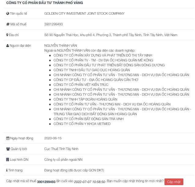 CTCP Đầu tư Thành phố Vàng là doanh nghiệp “non trẻ” mới 2 năm tuổi, thành lập ngày 15/6/2020 với vốn điều lệ ban đầu 400 tỷ đồng,hiện tại công ty đã tăng vốn điều lệ lên thành 420 tỷ đồng. Công ty đặt địa chỉ trụ sở chính tại số 90 Nguyễn Thái Học, khu phố 4 phường 3 Thành phố Tây Ninh. Người đại diện theo pháp luật đầu tiên là ông Trương Anh Tuấn.