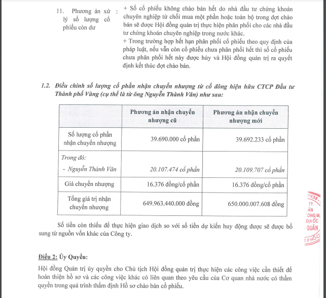 Như vậy, tổng cổ phiếu dự kiến nhận chuyển nhượng từ cổ đông hiện hữu của CTCP Đầu tư Thành phố Vàng là 39.692.233 cổ phiếu, tương ứng giá trị hơn 650 tỷ đồng. Số tiền còn thiếu để thực hiện giao dịch so với số tiền dự kiến huy động được sẽ được bổ sung từ nguồn vốn khác của Công ty.