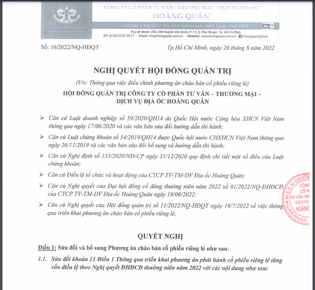 CTCP Tư vấn Thương mại Dịch vụ Địa ốc Hoàng Quân (Mã CK: HQC) vừa công bố nghị quyết số 16/2022/NQ-HĐQT về việc điều chỉnh phương án chào bán cổ phiếu riêng lẻ và nhận cổ phiếu từ cổ đông hiện hữu của CTCP Đầu tư Thành phố Vàng.
