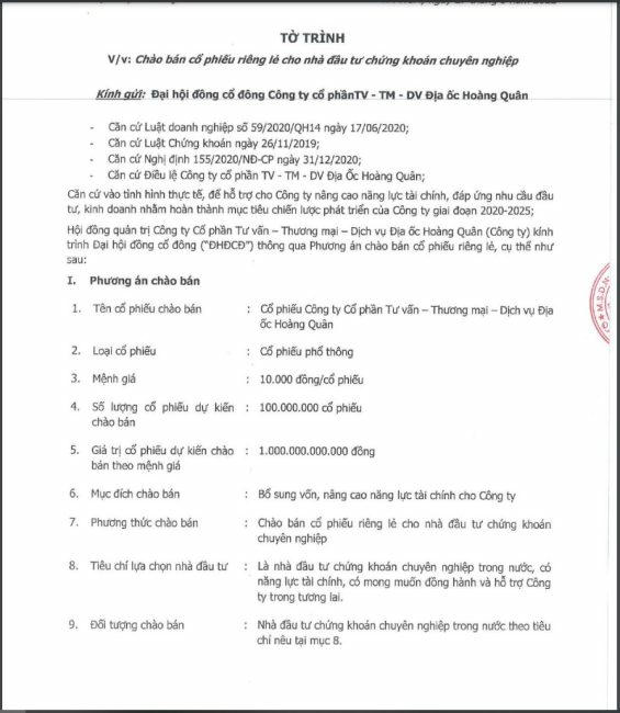 Theo tài liệu Đại hội đồng cổ đông thường niên 2022 vừa được công bố, HĐQT Công ty Cổ phần Tư vấn Thương mại Dịch vụ Địa Ốc Hoàng Quân (mã: HQC) dự kiến sẽ có tờ trình về việc chào bán riêng lẻ 100 triệu cổ phần nhằm huy động 1.000 tỷ đồng đầu tư mua cổ phần tại Công ty Cổ phần Đầu tư Thành Phố Vàng.