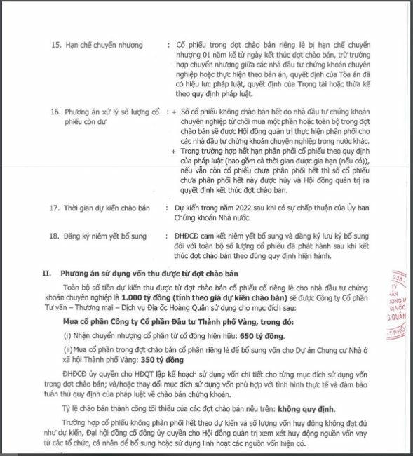 Cụ thể, theo phương án sử dụng vốn thu được từ đợt chào bán, Địa ốc Hoàng Quân dự kiến sẽ dụng 650 tỷ đồng nhận chuyển nhượng vốn từ cổ đông hiện hữu của Công ty Cổ phần Đầu tư Thành Phố Vàng; 350 tỷ đồng mua cổ phần trong đợt chào bán cổ phần riêng lẻ để bổ sung vốn tiếp tục đầu tư phát triển Dự án nhà ở xã hội Golden City.