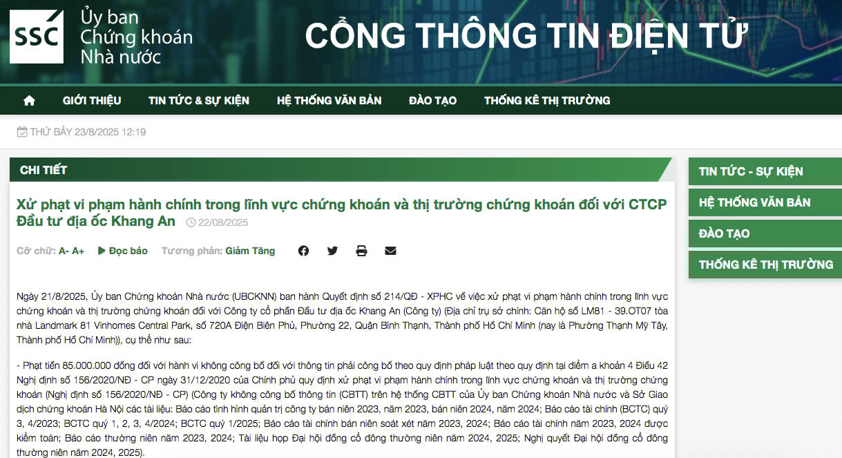 Trong đó, Địa ốc Khang An không công bố thông tin trên hệ thống công bố thông tin của UBCKNN và Sở Giao dịch chứng khoán Hà Nội các tài liệu bao gồm: báo cáo tình hình quản trị công ty bán niên 2023, năm 2023, bán niên 2024, năm 2024; báo cáo tài chính (BCTC) quý III, IV/2023; BCTC quý I, II, III, IV/2024; BCTC quý I/2025; Báo cáo tài chính bán niên soát xét năm 2023, 2024; báo cáo tài chính năm 2023, 2024 được kiểm toán; Báo cáo thường niên năm 2023, 2024; tài liệu họp ĐHĐCĐ thường niên năm 2024, 2025; Nghị quyết ĐHĐCĐ thường niên năm 2024, 2025.