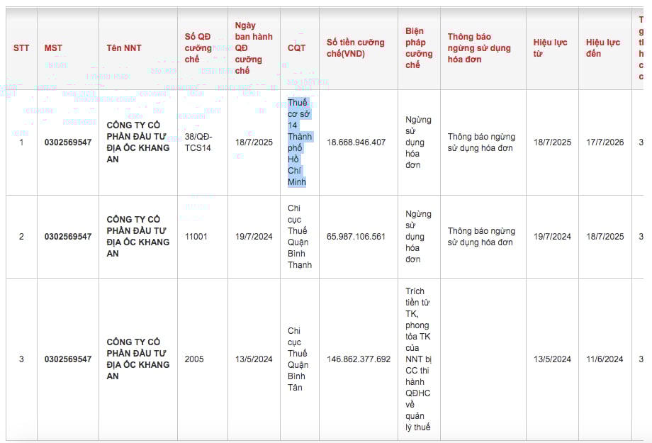 Ở một diễn biến khác có liên quan, mới đây Thuế cơ sở 14 Thành phố Hồ Chí Minh có thông báo về việc ngừng sử dụng hoá đơn đối với Công ty cổ phần Đầu tư địa ốc Khang An.