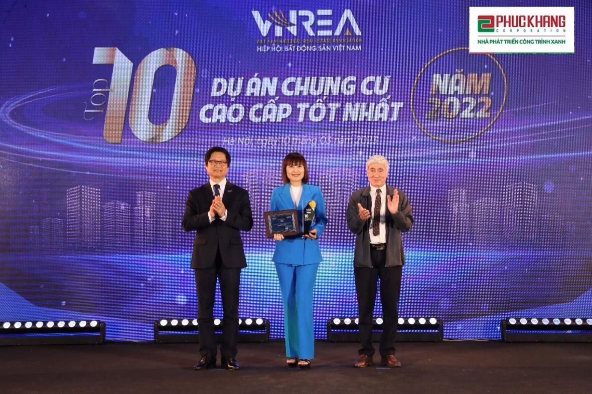 | Đại diện Phuc Khang Corporation (ở giữa) nhận giải thưởng “Top 10 dự án chung cư cao cấp tốt nhất năm 2022” cho công trình xanh Diamond Lotus Riverside. |