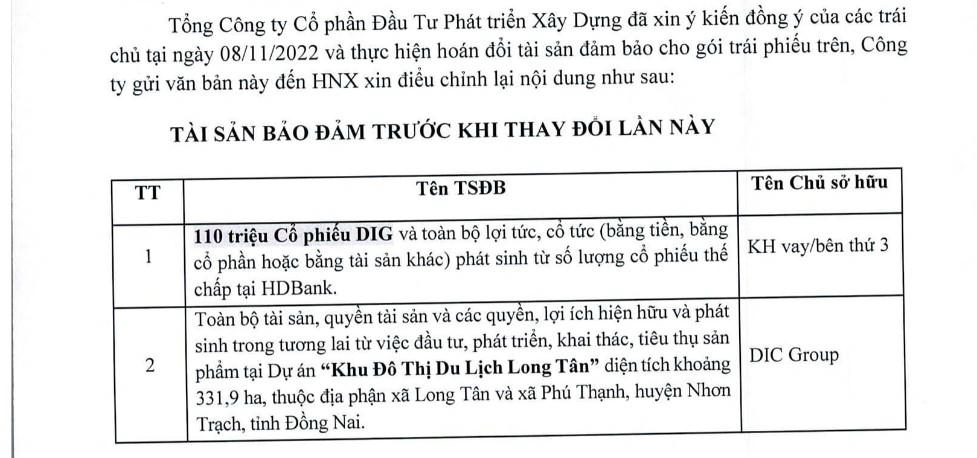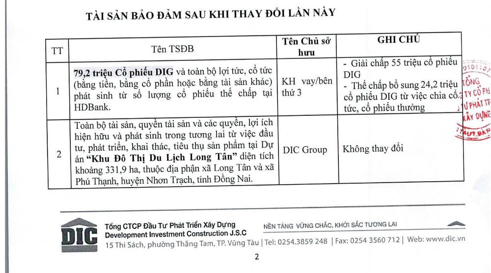 Tài sản đảm bảo sau khi thay đổi gồm 79,2 triệu cổ phiếu DIG và toàn bộ lợi tức (bằng tiền, bằng cổ phần hoặc bằng tài sản khác) phát sinh từ số lượng cổ phiếu thế chấp tại ngân hàng. Nguyên nhân là do DIC Corp bị bán giải chấp 55 triệu cổ phiếu DIG và sau đó doanh nghiệp đã bổ sung thêm 24,2 triệu cổ phiếu từ việc chia cổ tức, cổ phiếu thường.
