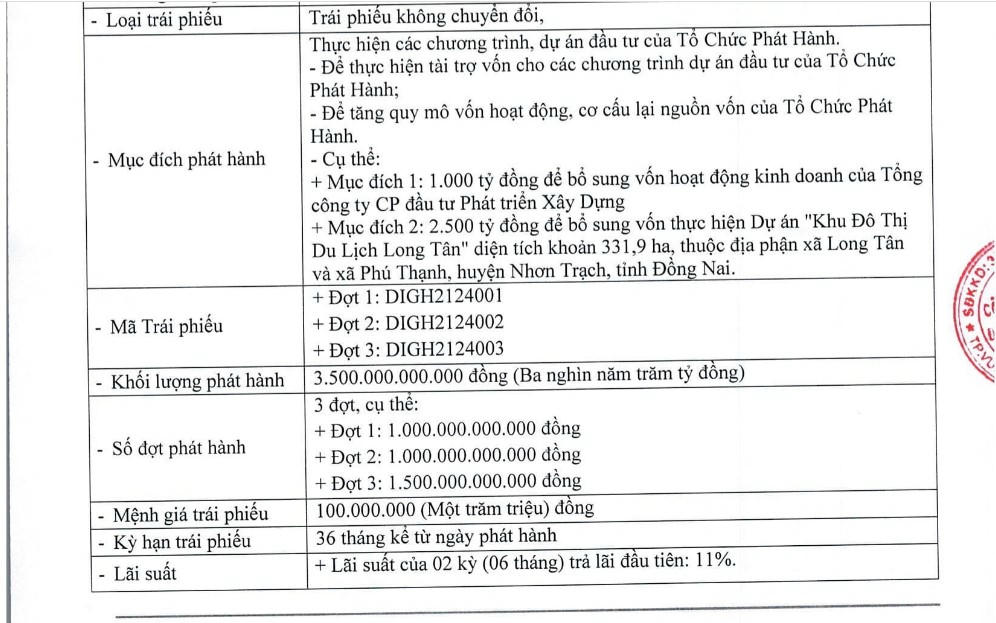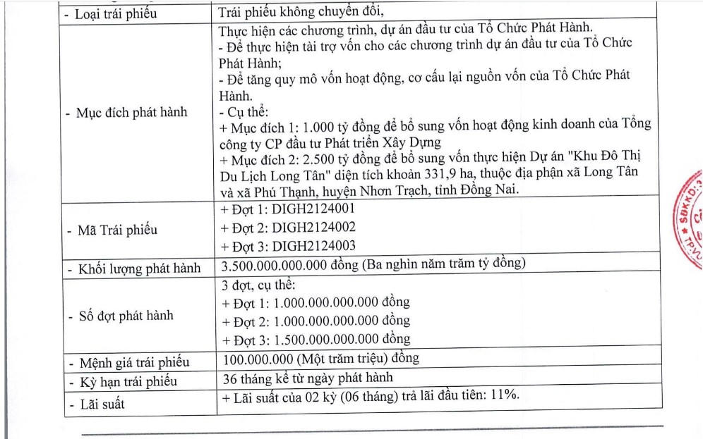 Về 3 lô trái phiếu trị giá 3.500 tỷ của DIC Corp, lô trái phiếu DIGH2124001 phát hành ngày 16/09/2021 với tổng mệnh giá 1.000 tỷ đồng, kỳ hạn 36 tháng và đáo hạn ngày 16/9/2024; lô trái phiếu DIGH2124002 phát hành ngày 30/9/2021 với tổng giá trị 1.000 tỷ đồng, kỳ hạn 36 tháng và đáo hạn ngày 30/9/2024 và lô trái phiếu DIGH2124003 phát hành ngày 26/11/2021 với tổng mệnh giá 1.500 tỷ đồng, thời hạn 36 tháng và đáo hạn ngày 26/11/2024.
