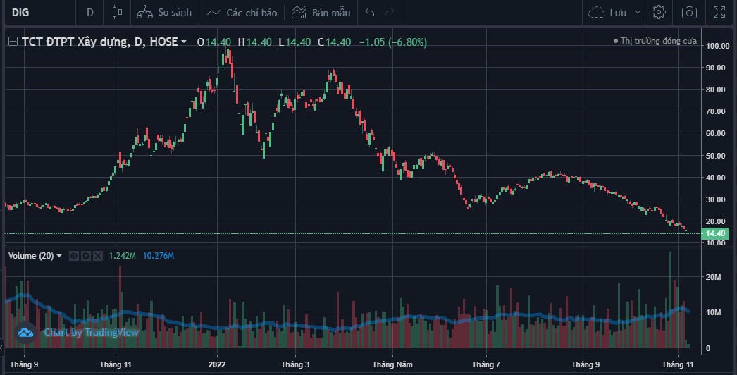 Kết phiên giao dịch ngày 8/11/2022, cổ phiếu DIG đang giao dịch vùng 14.400 đồng/cổ phiếu, đã trải qua 3 phiên dư bán sàn liên tục và đồng thời giảm 85,3% từ 98.200 đồng/cổ phiếu (ngày 11/1/2022).