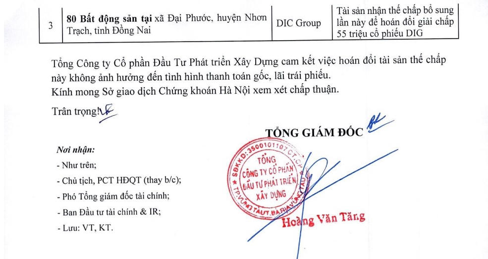 Đồng thời, DIC Corp cũng bổ sung 80 bất động sản tại xã Đại Phước, huyện Nhơn Trạch, tỉnh Đồng Nai làm tài sản đảm bảo thay cho 3 lô trái phiếu thay thế cho 55 triệu cổ phiếu của bên thứ ba vừa bị bán giải chấp.