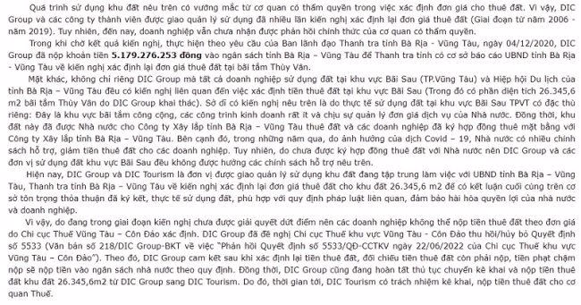 DIC Group lý giải, do đang trong giai đoạn kiến nghị chưa được giải quyết dứt điểm nên các doanh nghiệp không thể nộp tiền thuê đất theo đơn giá do Chi cục Thuế Vũng Tàu – Côn Đảo xác định. DIC Group đã đề nghị Chi cục Thuế khu vực Vũng Tàu – Côn Đảo thu hồi/hủy bỏ Quyết định số 5533 (Văn bản số 218/DIC Group-BKT về việc “Phản hồi Quyết định số 5533/QĐ-CCTKV ngày 22/06/2022 của Chi cục Thuế khu vực Vũng Tàu – Côn Đảo”).