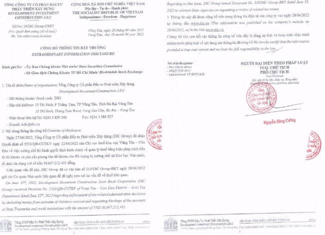 Ngày 27/6, DIC Corp đã nhận Quyết định số 5533/QĐ-CCTKV ngày 22/6/2022 của Chi cục thuế khu vực Vũng Tàu – Côn Đảo về việc cưỡng chế thi hành quyết định hành chính về quản lý thuế bằng biện pháp trích tiền từ tài khoản và yêu cầu phong tỏa tài khoản của đối tượng bị cưỡng chế tại Kho bạc Nhà nước, tổ chức tín dụng với số tiền hơn 30,61 tỷ đồng.