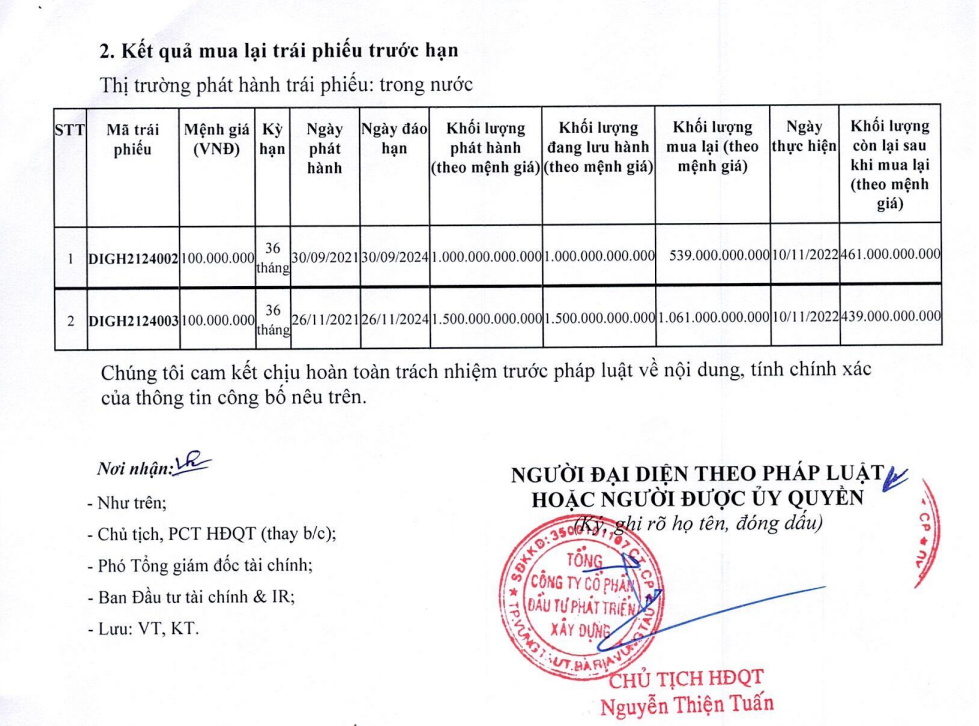 Cụ thể, ngày 10/11, DIC Corp hoàn tất mua lại 539 tỷ đồng trái phiếu trước hạn lô trái phiếu mã DIGH2124002, kỳ hạn 36 tháng, phát hành ngày 30/9/2021 và đáo hạn ngày 30/9/2024 với mệnh giá 1.000 tỷ đồng. Như vậy, khối lượng mã trái phiếu này hiện còn lại 461 tỷ đồng.