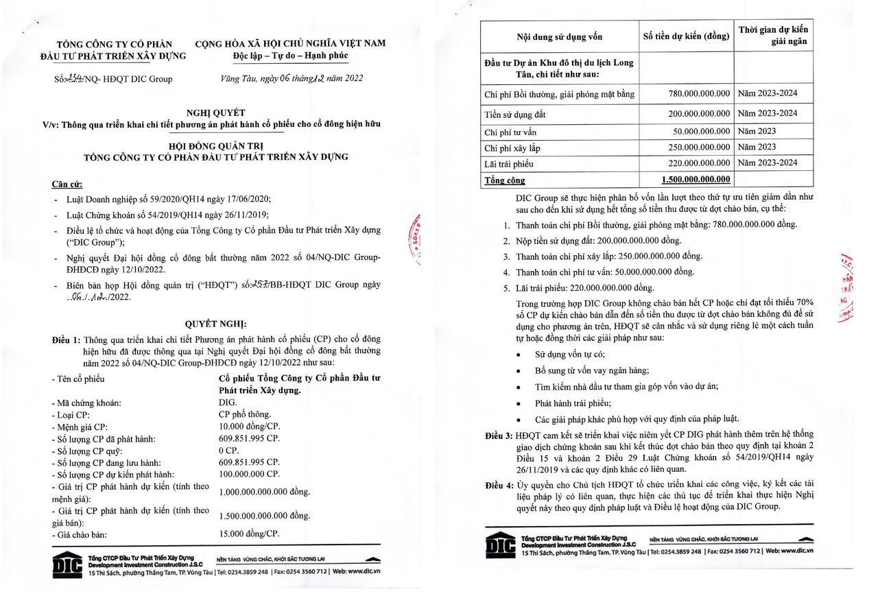 DIG cũng cho biết, toàn bộ số tiền huy động được sẽ được Công ty sử dụng để đầu tư vào dự án Khu đô thị du lịch Long Tân.