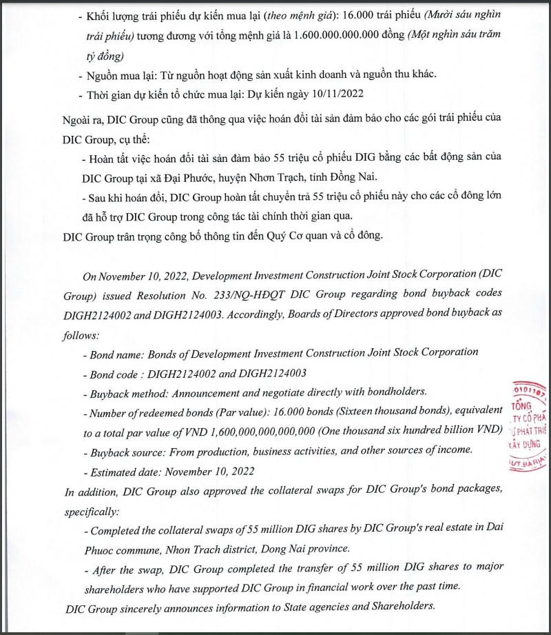 Ở một diễn biến mới đây, DIC Corp cũng thông báo việc hoán đổi tài sản bảo đảm cho các gói trái phiếu của doanh nghiệp này, cũng như hoàn tất việc hoán đổi tài sản bảo đảm 55 triệu cổ phiếu DIG bằng các bất động sản của công ty tại tỉnh Đồng Nai.