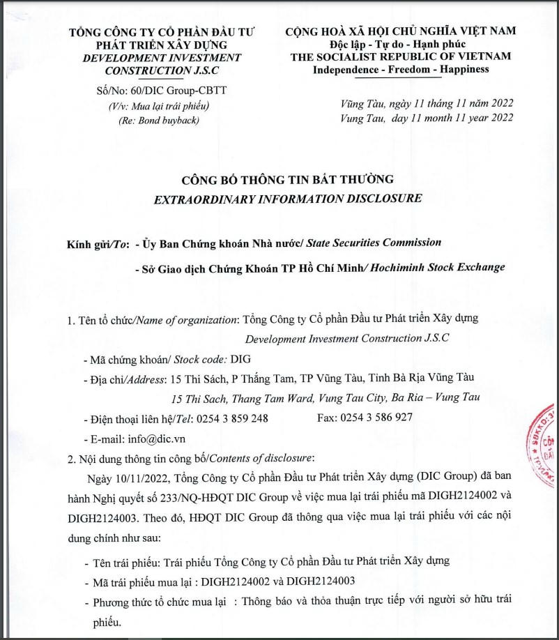 Cụ thể, hai lô trái phiếu được DIG dự kiếm mua lại có mã là DIGH2124002 và DIG2124003. Tổng khối lượng của 2 lô trái phiếu là 16.000 đơn vị, tương ứng với tổng mệnh giá là 1.600 tỷ đồng. Thời gian dự kiến tổ chức mua lại vào ngày 10/11/2022.