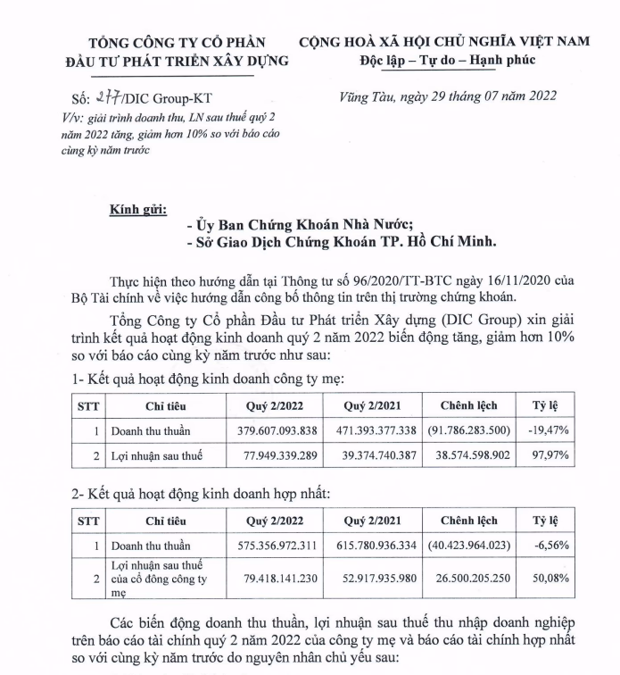 Giải trình về các biến động doanh thu thuần, LNST thu nhập doanh nghiệp trên BCTC quý II/2022 của công ty mẹ và BCTC hợp nhất so với cùng kỳ năm trước, DIC cho biết: