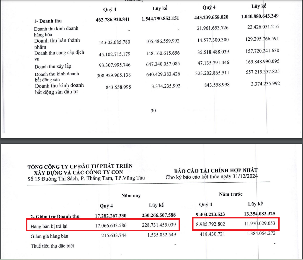 Một điểm cũng đáng lưu ý trong năm 2024, DIC Corp bất ngờ ghi nhận hàng bán bị trả lại tới 228,7 tỷ đồng so với cùng kỳ chỉ 11,97 tỷ đồng, tăng thêm 216,76 tỷ đồng.