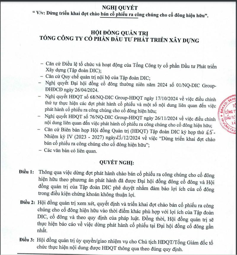 Tuy nhiên, trong thông báo về việc dừng triển khai đợt chào bán cổ phiếu, DIC Corp cho biết lý do là doanh nghiệp nhận thấy điều kiện thị trường chứng khoán trong giai đoạn hiện nay không thuận lợi do nhiều diễn biến bất lợi như thị trường chứng khoán giao dịch ảm đảm với thanh khoản thấp, áp lực bán ròng từ khối ngoại mạnh và kéo dài liên tục từ đầu năm 2024, áp lực tỷ giá, chính sách liên quan đến lãi suất…