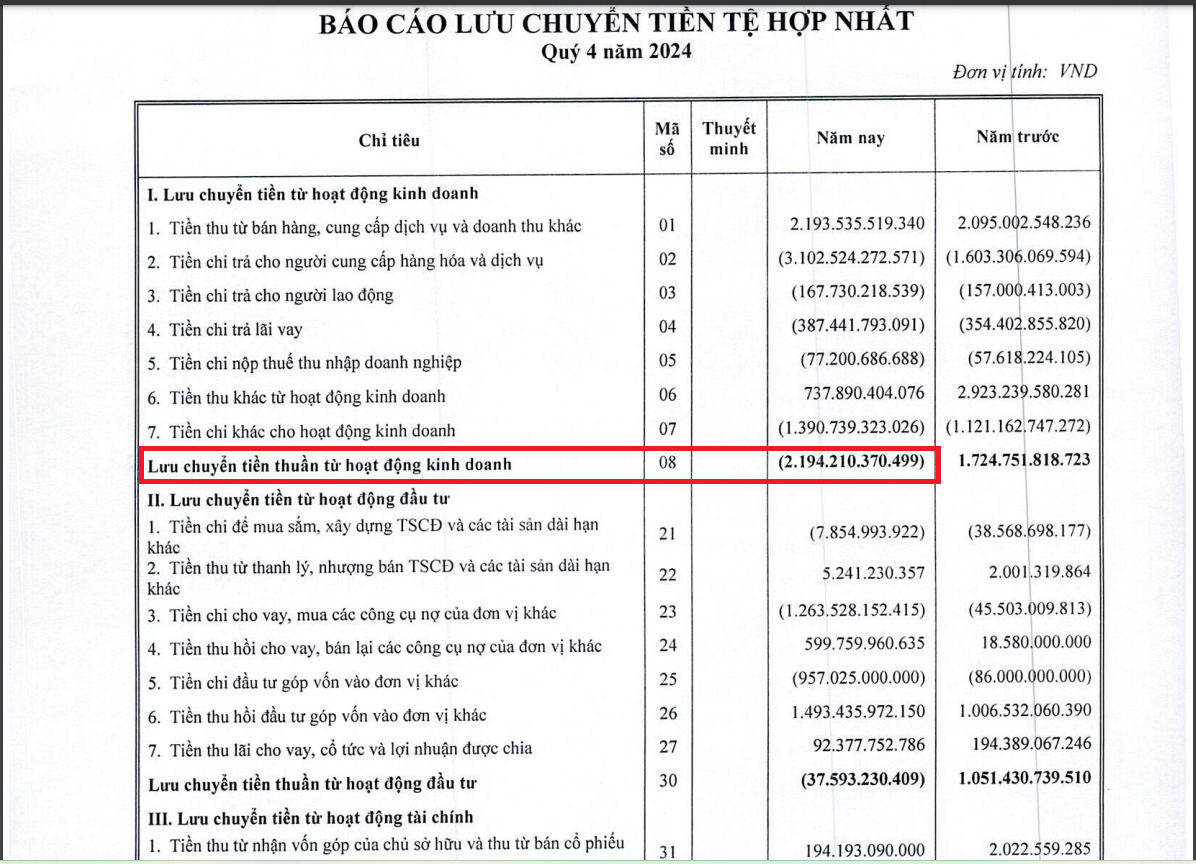 Cụ thể, trong năm 2024, dòng tiền kinh doanh chính của DIC Group ghi nhận âm 2.194,2 tỷ đồng so với cùng kỳ dương 1.724,8 tỷ đồng. Ngoài ra, cũng trong kỳ, dòng tiền đầu tư âm 37,6 tỷ đồng và dòng tiền tài chính dương 819,7 tỷ đồng, chủ yếu tăng thêm nợ vay để bù đắp thâm hụt dòng tiền kinh doanh.