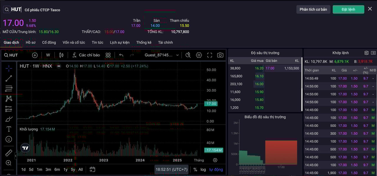 Trên sàn HNX, cổ phiếu HUT của Công ty Cổ phần Tasco thu hút sự chú ý đặc biệt khi là mã duy nhất trong nhóm HNX30 giữ được sắc tím. Đà tăng của HUT xuất phát từ các thông tin tích cực liên quan đến hệ sinh thái doanh nghiệp Tasco.