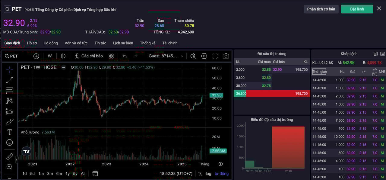 Ngoài PET, các cổ phiếu giữ được sắc tím trên sàn HoSE trong phiên hôm nay còn có DLG, ADS và C47. Không chỉ tăng mạnh về giá, các mã này còn ghi nhận mức thanh khoản cao, cho thấy dòng tiền đang có xu hướng tìm đến những cổ phiếu vốn hóa vừa và nhỏ. So với mặt bằng chung, thị giá của ba cổ phiếu này vẫn ở mức thấp, được đánh giá là còn hấp dẫn và phần nào “rẻ” hơn so với nhiều mã khác trên thị trường.