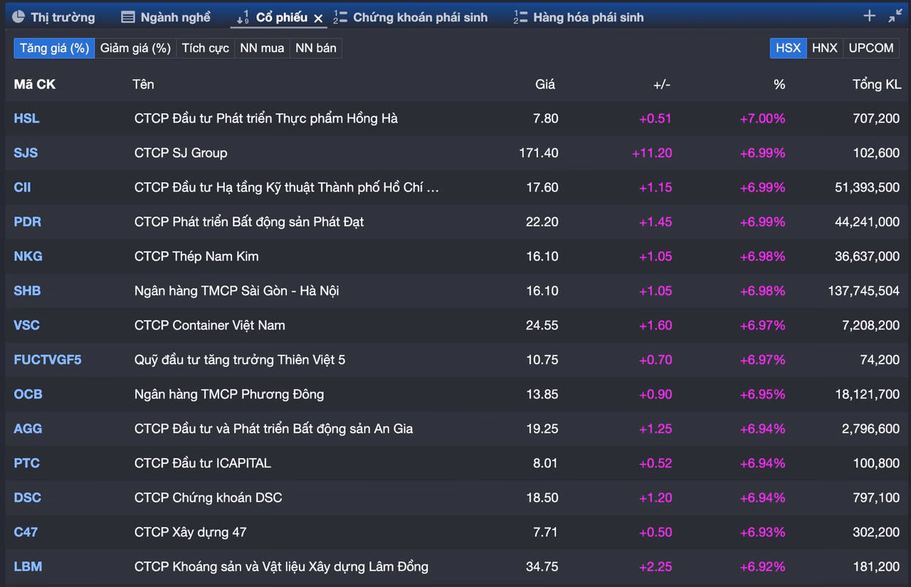 Tại nhóm bất động sản, cái tên gây chú ý đặc biệt là SAM – một trong hai mã đầu tiên được niêm yết trên thị trường chứng khoán Việt Nam. Kỷ niệm 25 năm ngày lên sàn, cổ phiếu này tăng hết biên độ, đóng cửa tại 7.910 đồng/cp với thanh khoản hơn 2,9 triệu đơn vị. Bên cạnh đó, các mã như DIG, NHA, PDR, ITC... cũng lần lượt “khoác áo tím”, góp phần củng cố làn sóng tăng lan tỏa khắp thị trường.