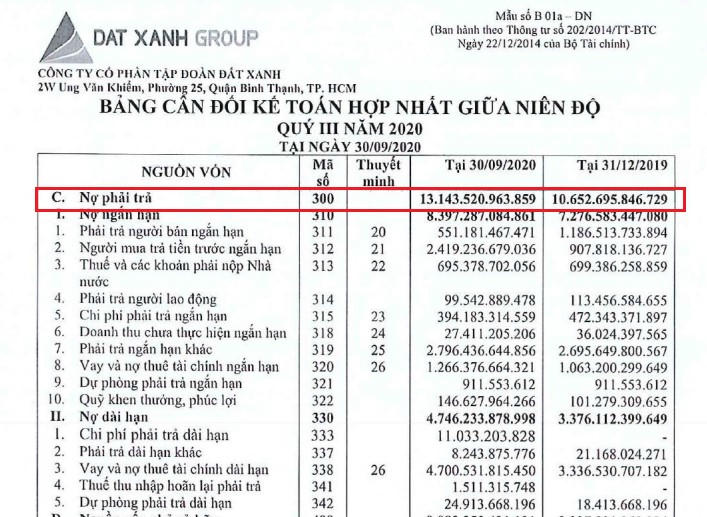 Một “đại gia” bất động sản khác cũng đang có tỷ lệ nợ ngày càng lớn, đó là Công ty CP Tập đoàn Đất Xanh (DXG). Theo BCTC Quý 3/2020 được Đất Xanh Group công bố, nợ phải trả của DXG tính đến cuối tháng 9/2020 là 13.143 tỷ đồng, tăng gần 2.500 tỷ đồng so với đầu năm.