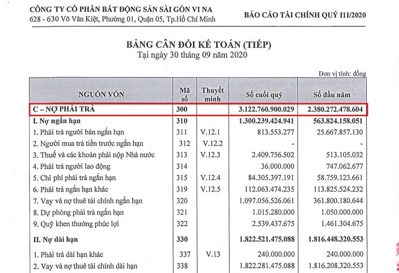 Cụ thể, Theo BCTC quý 3/2020 của Công ty Cổ phần Bất động sản Sài Gòn Vi Na (Land Saigon – LSG) cho thấy, doanh nghiệp này đang ghi nhận con số nợ phải trả lớn.