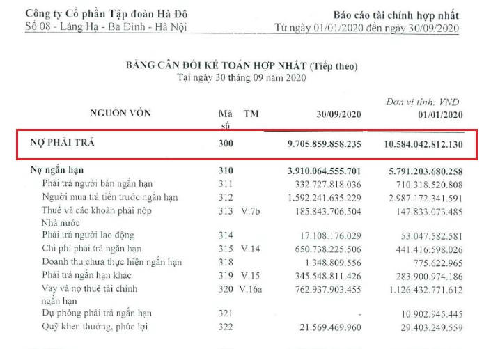 Theo BCTC hợp nhất Quý 3/2020 được Hà Đô công bố, tính đến 30/9/2020, tổng nợ phải trả của Hà Đô (HDG) ở mức 9.705 tỷ đồng, giảm 880 tỷ đồng so với thời điểm đầu năm.
