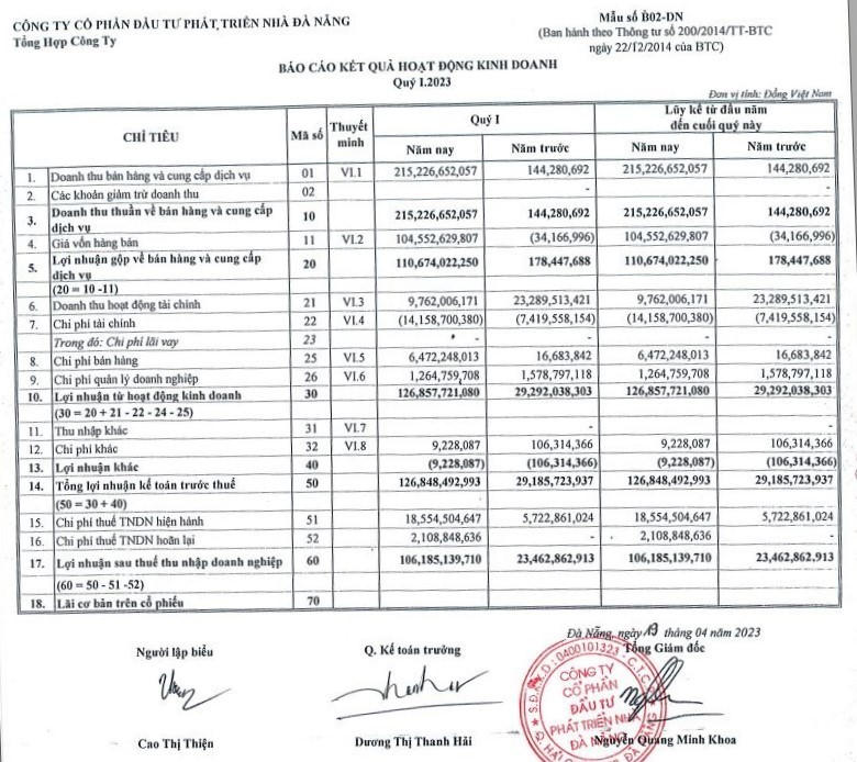 Trong kỳ, NDN ghi nhận doanh thu tăng đột biến trong quý đầu năm 2023 so với cùng kỳ khi có doanh thu không đáng kể. Trong kỳ, lợi nhuận gộp tăng thêm 110,49 tỷ đồng, lên 110,67 tỷ đồng (cùng kỳ 0,18 tỷ đồng); doanh thu tài chính giảm 58,1% so với cùng kỳ, tương ứng giảm 13,53 tỷ đồng, về 9,76 tỷ đồng; chi phí tài chính tăng 90,8%, tương ứng tăng thêm 6,74 tỷ đồng, lên 14,16 tỷ đồng; chi phí bán hàng và quản lý doanh nghiệp tăng 396,3%, tương ứng tăng thêm 6,18 tỷ đồng, lên 7,74 tỷ đồng và các hoạt động khác biến động không đáng kể.