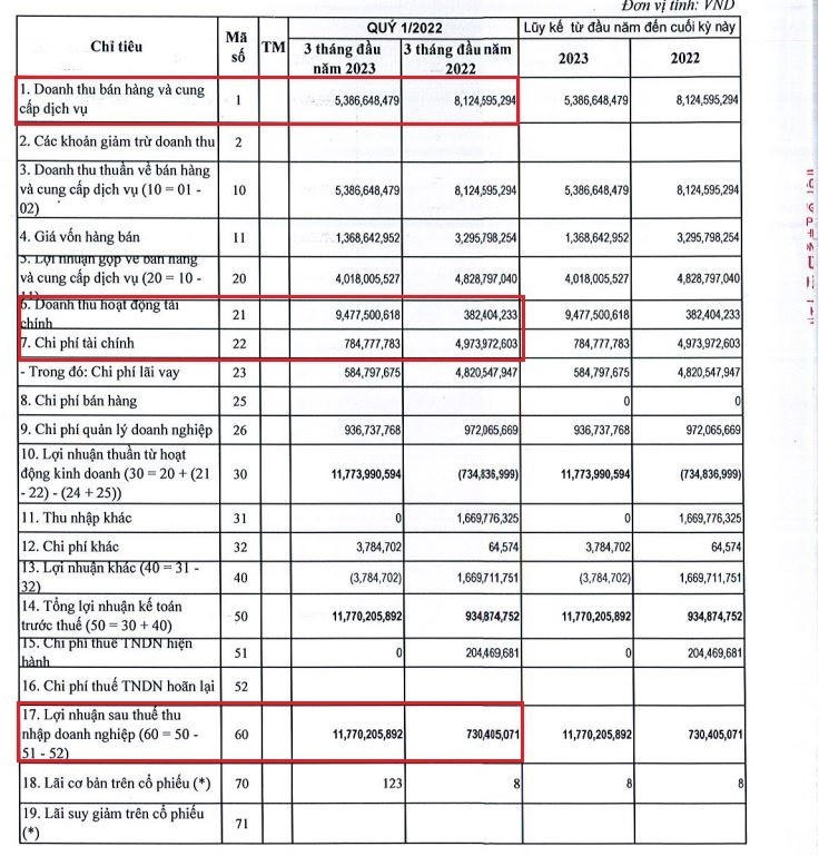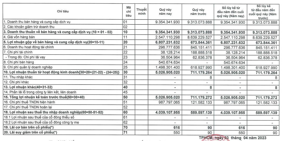 Doanh thu về bán hàng và cung cấp dịch vụ chỉ tăng nhẹ so với cùng kỳ năm trước, đạt gần 9,4 tỷ đồng nhưng nhờ vào giá vốn bán hàng thấp hơn so với cùng kỳ, chỉ ghi nhận 2,5 tỷ đồng nên tăng trưởng lợi nhuận tốt hơn.