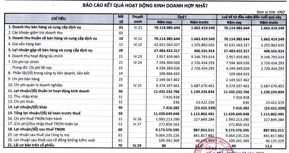 Theo giải trình từ phía công ty, doanh thu tăng trưởng mạnh là do ghi nhận doanh thu từ các sản phẩm bất động sản thuộc dự án KĐT Bảo Ninh 2 tại TP Đồng Hới, tỉnh Quảng Bình được bàn giao cho khách hàng trong kỳ.