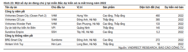 VNDirect cũng nhận định, Vinhomes sẽ tiếp tục dẫn dắt thị trường bất động sản miền Bắc giai đoạn 2022-2023 với ba dự án khu đô thị mới ra mắt gồm Vinhomes Dream City (Ocean Park 2), Vinhomes Cổ Loa (Đông Anh, Hà Nội), Vinhomes Wonder Park (Đan Phượng, Hà Nội).