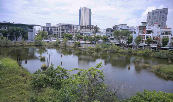 Dự án khu phức hợp trung tâm thương mại, căn hộ cao cấp và khách sạn 5 sao Đà Nẵng Center có 3 mặt tiền đường Phan Châu Trinh, Hùng Vương và Nguyễn Thị Minh Khai; nằm cạnh Nhà hát Trưng Vương (quận Hải Châu) treo hơn 10 năm nay, dự án chỉ có vài cọc bê tông, bỏ mặc cho cỏ mọc hoang, nước đọng, gây ô nhiễm môi trường (Ảnh: Thế Sơn)