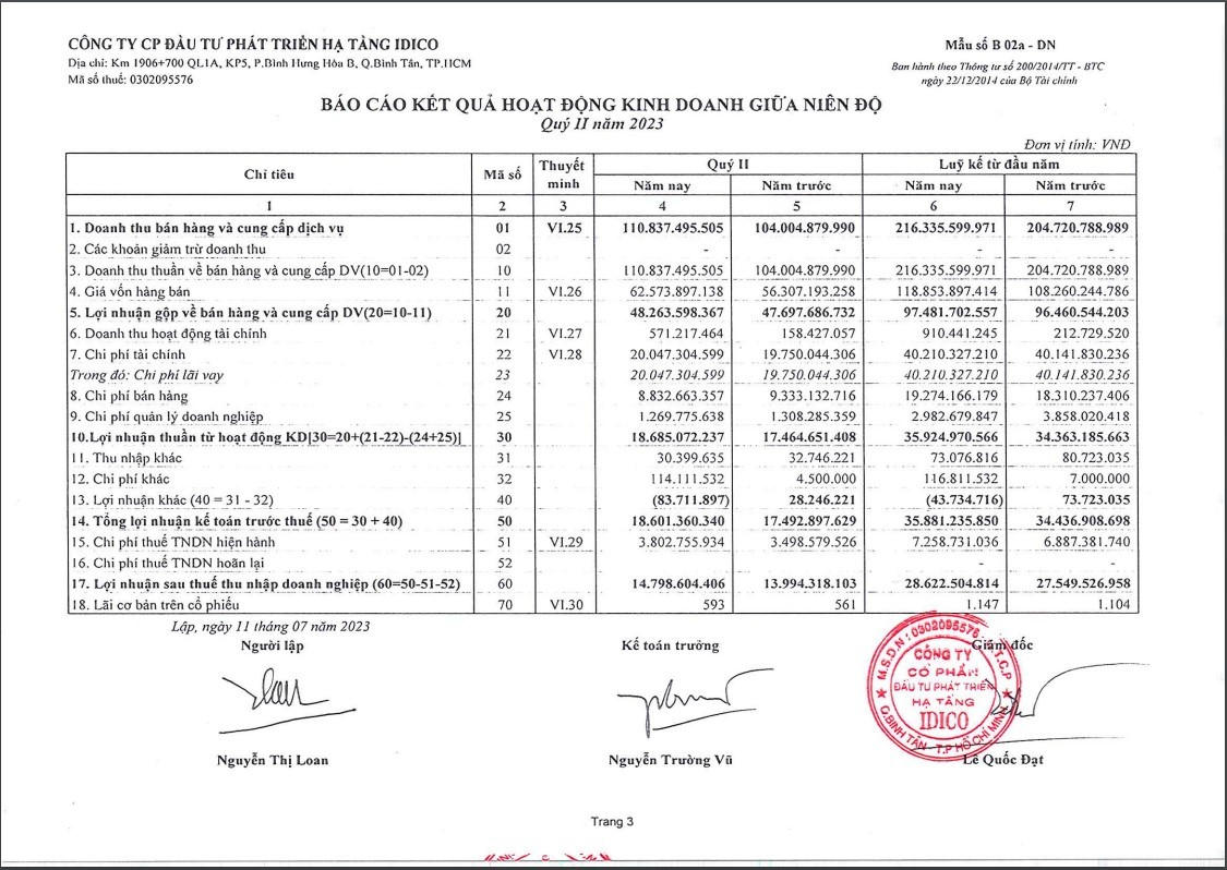 Lũy kế 6 tháng đầu năm, Hạ tầng Idico đạt 216,3 tỷ đồng doanh thu và 28,6 tỷ lãi ròng, tăng lần lượt 6% và 4% so với cùng kỳ.