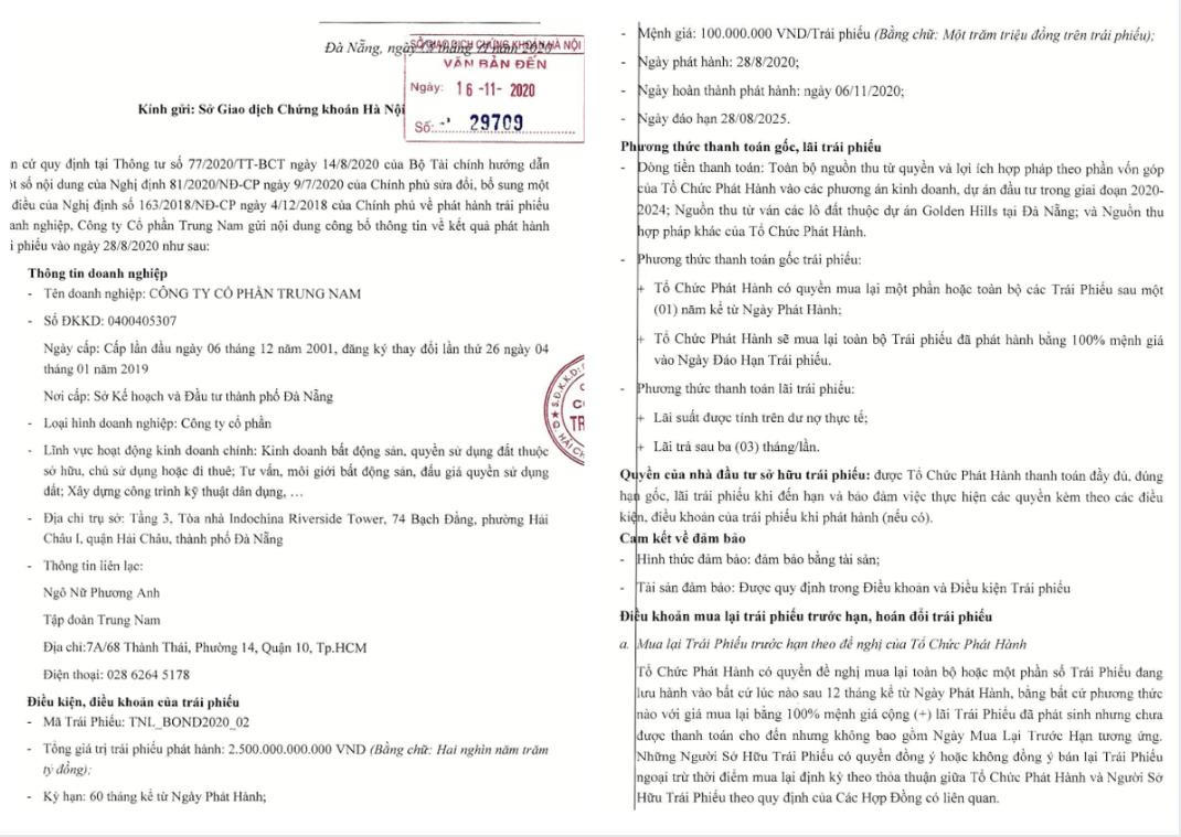 Cụ thể, theo công bố của Sở Giao dịch Chứng khoán Hà Nội (HNX), Trung Nam – thành viên Trung Nam Group vừa hoàn tất đợt phát hành 2.500 tỷ đồng trái phiếu vào ngày 6/11 vừa qua. Vào tháng 5, doanh nghiệp này cũng đã huy động thành công 1.400 tỷ đồng trái phiếu kỳ hạn 5 năm và 600 tỷ đồng trái phiếu kỳ hạn 3 năm.