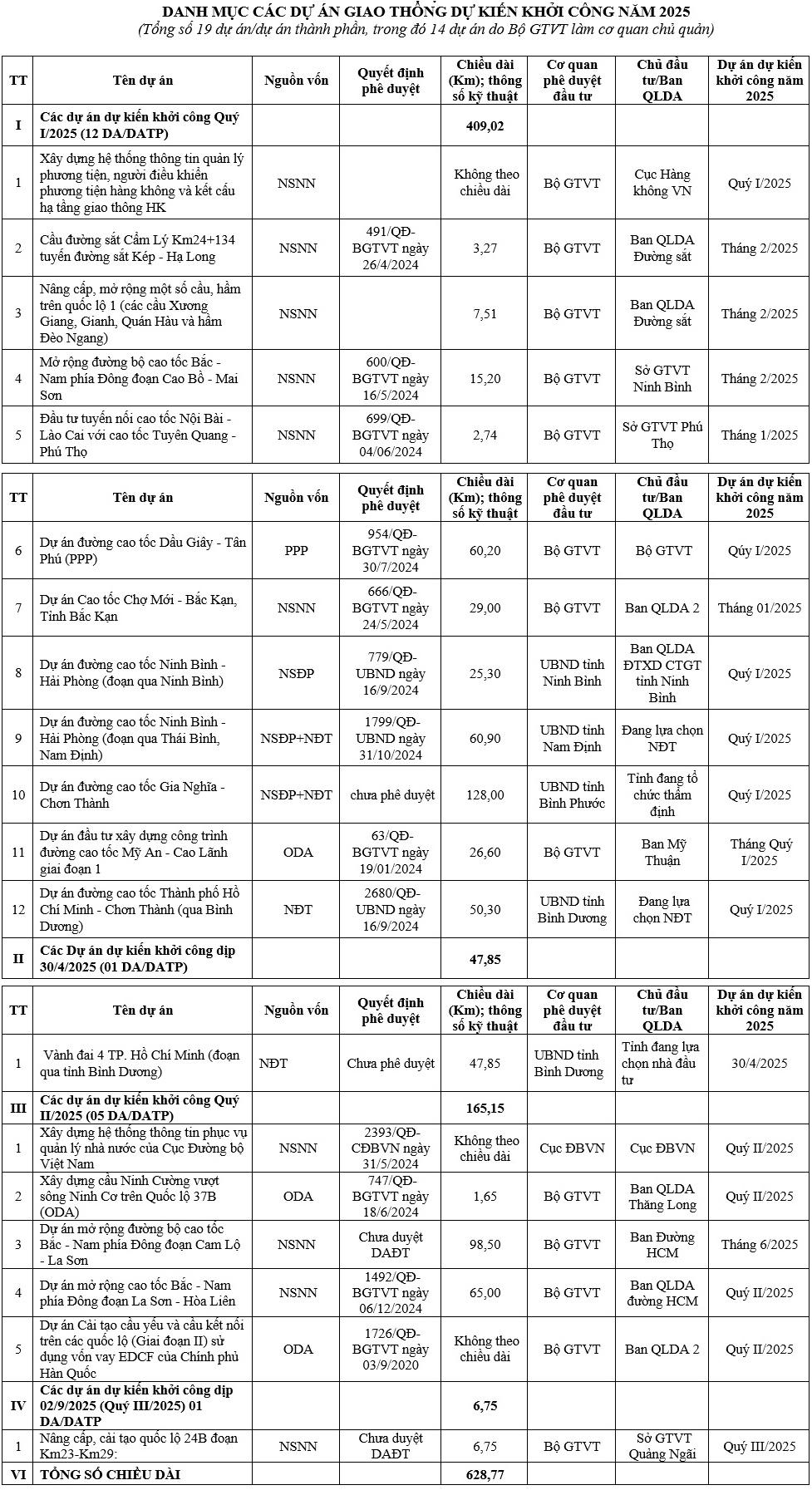 Trong năm 2025, Bộ GTVT phấn đấu khởi công 19 dự án, trong đó có 14 dự án do Bộ là cơ quan chủ quản, 5 dự án do địa phương là cơ quan chủ quản. Cũng trong năm 2025, sẽ hoàn thành 50 dự án.