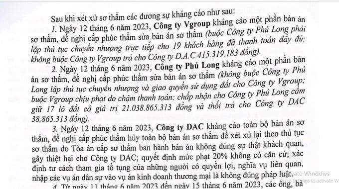 Tương tự, Bản án thẩm số 08/2023/KDTM-PT ngày 28/9/2023 buộc Công ty TNHH Phú Long lập thủ tục chuyển nhượng và giao sổ đỏ cho 39 khách hàng được Công ty VGROUP chỉ định và xuất hóa đơn cho các khách hàng cụ thể do Công ty VGROUP chỉ định (có danh sách kèm theo bản án). Mặc dù Công ty VGROUP không phải là bên mua của hợp đồng mua bán số 17, cũng không có chứng từ nào thể hiện việc Công ty VGROUP chuyển tiền cho Công ty TNHH Phú Long.