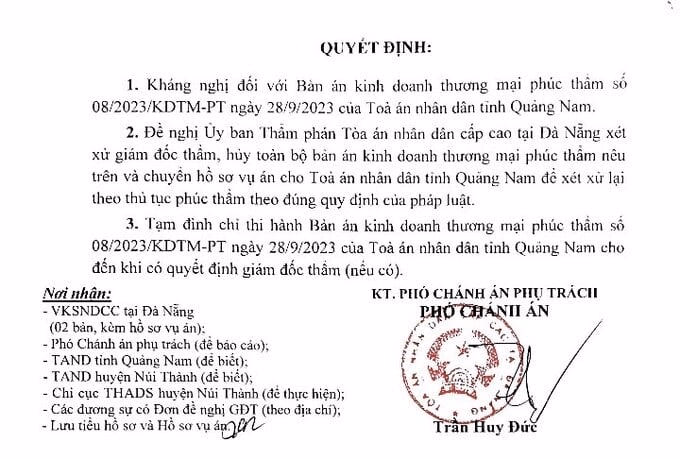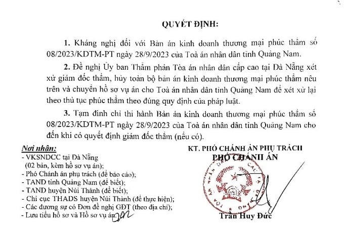 Mới đây, ông Trần Huy Đức – Phó Chánh án TAND cấp cao tại Đà Nẵng đã ký Quyết định kháng nghị đối với Bản án kinh doanh thương mại phúc thẩm số 08/2023/KDTM-PT ngày 28/9/2023 của TAND tỉnh Quảng Nam. Quyết định đề nghị Ủy ban thẩm phán TAND cấp cao tại Đà Nẵng xét xử giám đốc thẩm, hủy toàn bộ Bản án phúc thẩm số 08/2023; chuyển hồ sơ vụ án cho TAND tỉnh Quảng Nam xét xử lại.