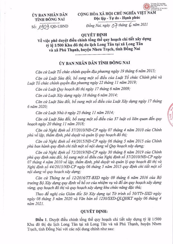 Mới đây, UBND tỉnh Đồng Nai đã có quyết định phê duyệt Điều chỉnh tổng thể quy hoạch xây dựng tỷ lệ 1/500 Khu đô thị du lịch Long Tân tại huyện Nhơn Trạch (Đồng Nai).