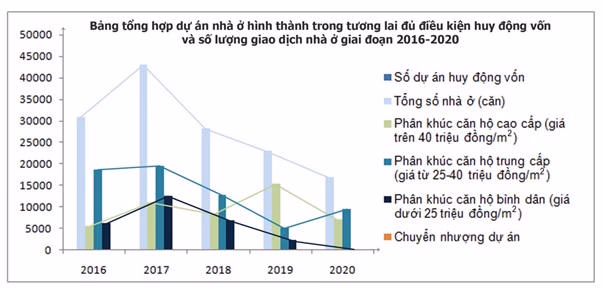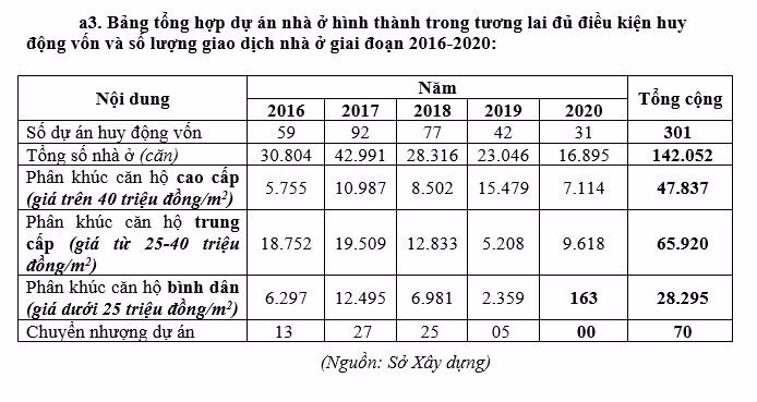 Các dự án nhà ở đủ điều kiện huy động vốn bị giảm mạnh trong 03 năm gần đây: Số lượng dự án năm 2018 giảm 16,4%; năm 2019 giảm 54,4%; năm 2020, giảm đến 64,3% so với năm 2017. Tương ứng, số lượng nhà ở huy động vốn cũng giảm mạnh trong 03 năm gần đây: Năm 2018 giảm 34,2%; năm 2019 giảm 46,4%;năm 2020, giảm đến 60,7% so với năm 2017.