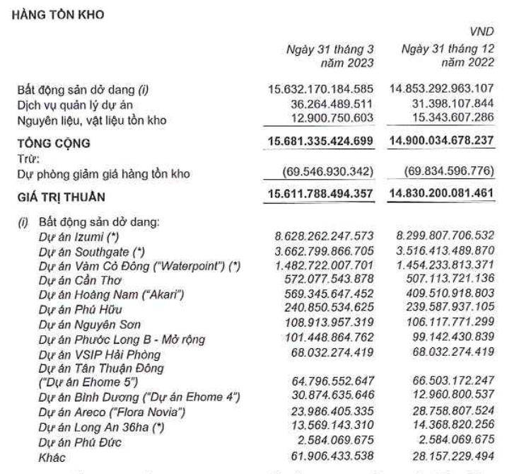 | Danh mục hàng tồn kho của Nam Long tính đến cuối quý I/2023. |