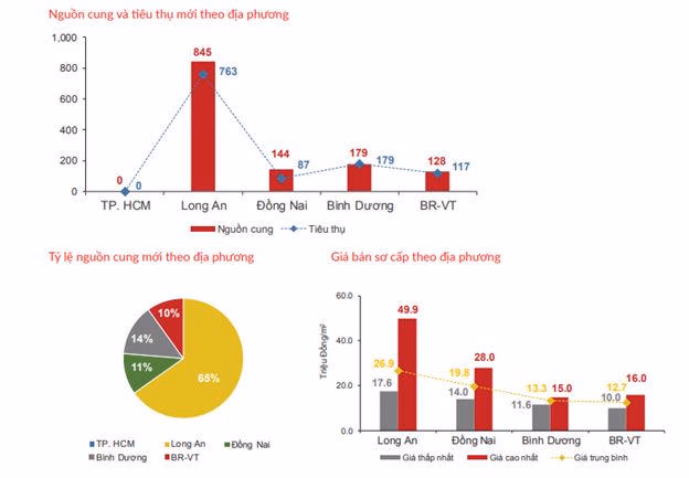 Nguồn cung của tỉnh này đạt 845 nền, cao nhất trong 5 địa phương, gấp khoảng 6 lần Đồng Nai, Bình Dương, Bà Rịa - Vũng Tàu trong khi TP HCM không có nền nào được bán ra. Bản thân Long An chiếm 65% nguồn cung đất nền mới toàn thị trường. Tỷ lệ tiêu thụ của Long An cũng đạt 90%.